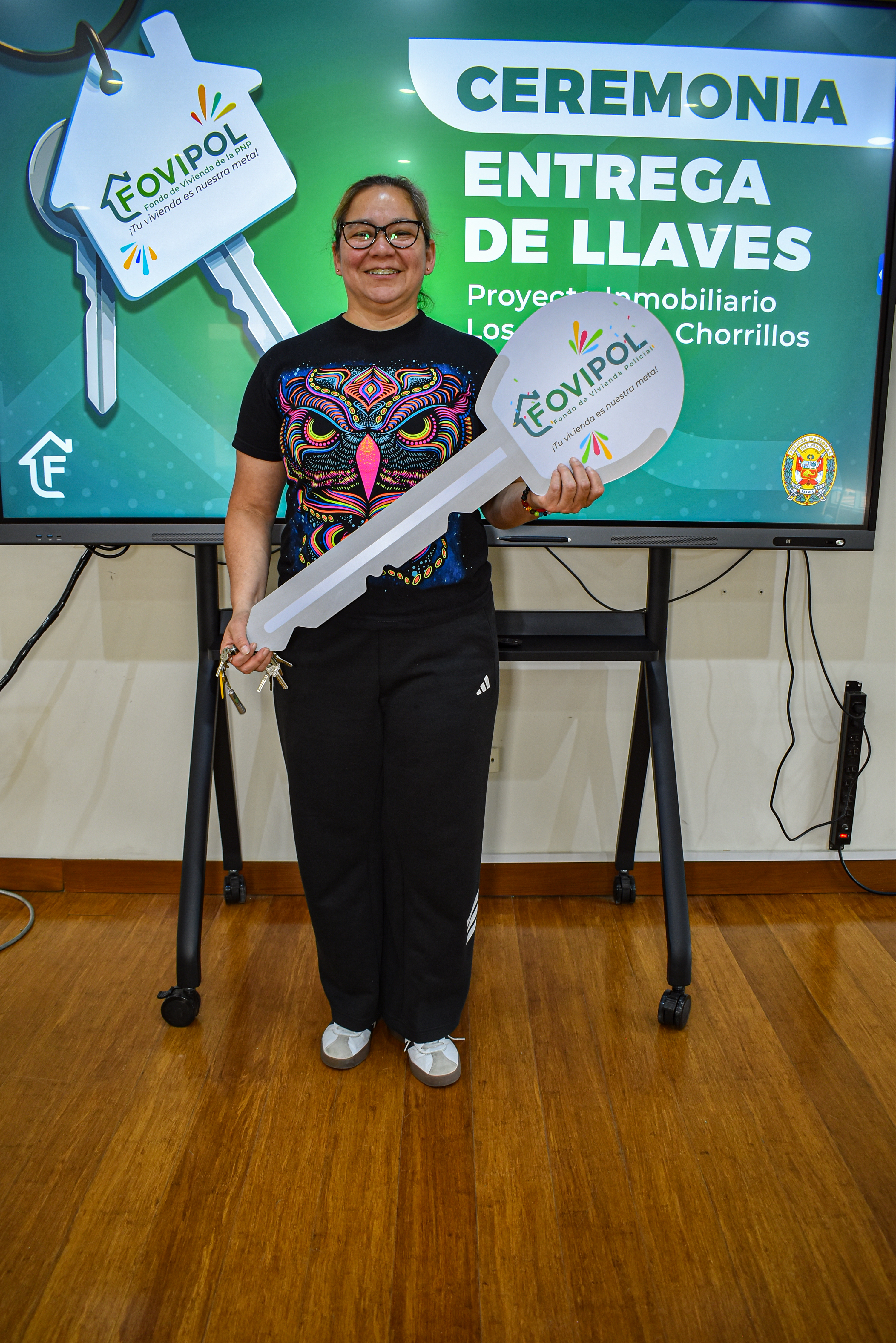 Con gran emoción y orgullo, el Fondo de Vivienda Policial (FOVIPOL) realizó la entrega oficial de llaves a la Comandante PNP Carmen Tobies Laulate, administrada que hoy cumple el sueño de acceder a su vivienda propia en el Proyecto Inmobiliario “Los Faisanes”, ubicado en el distrito de Chorrillos.