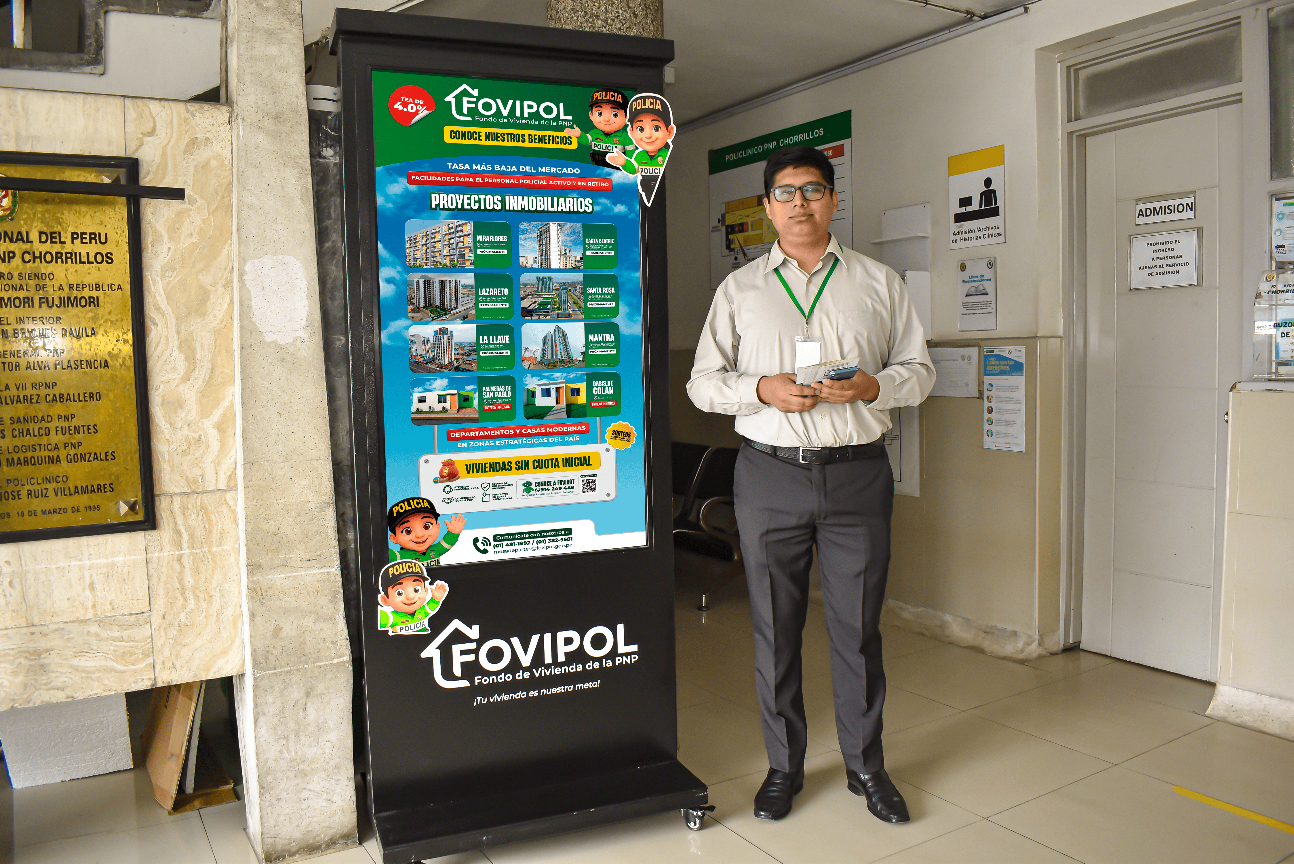 La actividad se desarrolló en el Policlínico PNP Chorrillos, donde el equipo técnico y de atención al cliente de FOVIPOL atendió consultas, explicando detalles sobre los nuevos proyectos habitacionales en Surco, Cercado de Lima, San Martín de Porres y Santa Anita, así como los requisitos y modalidades de financiamiento disponibles para nuestros administrados.