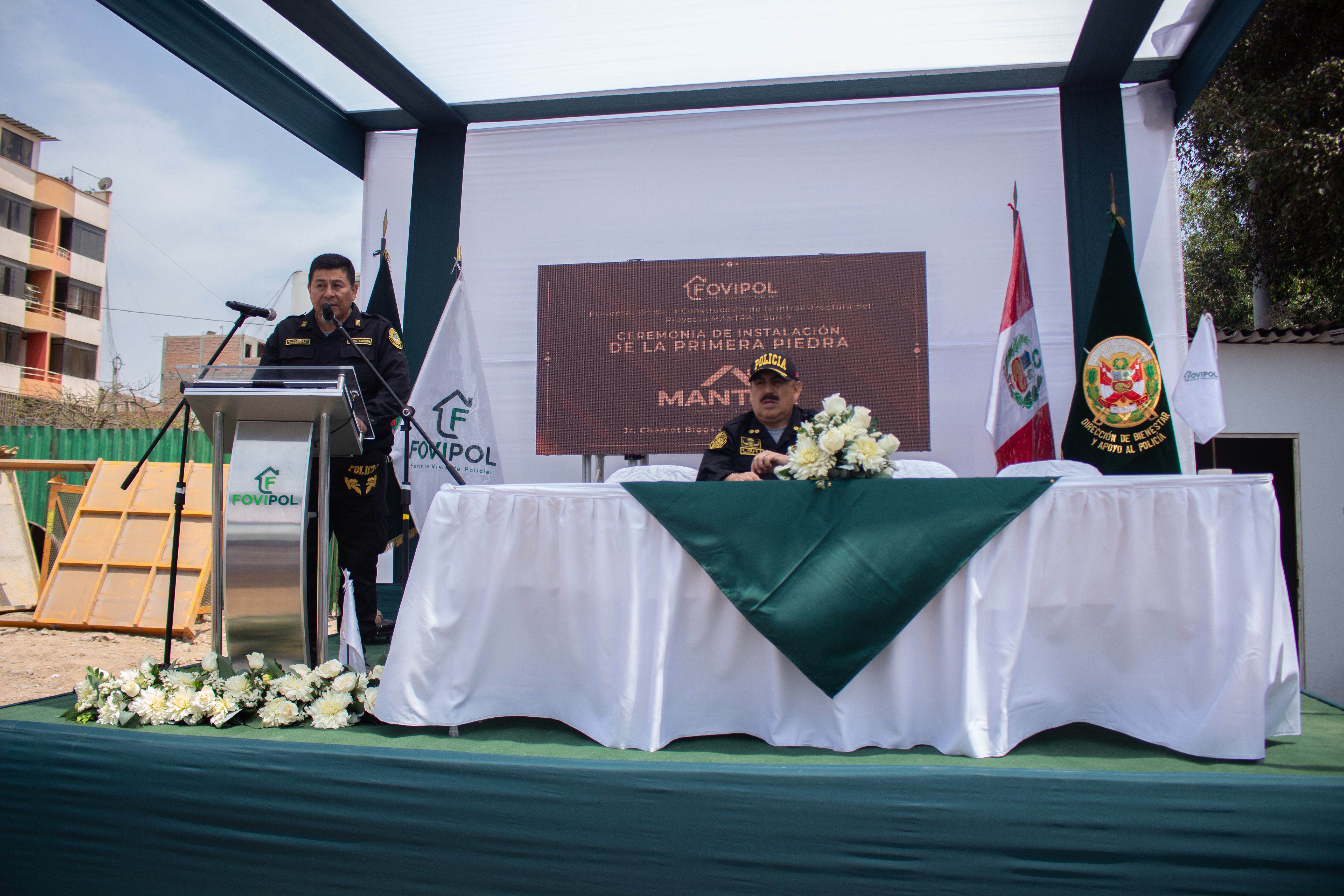 El Fondo de Vivienda de la Policía Nacional del Perú (FOVIPOL) realizó el pasado 18 de noviembre la ceremonia de instalación de la primera piedra del nuevo proyecto de vivienda “MANTRA”, un moderno complejo habitacional ubicado en Jirón Chamot con Calle Alondra, en el distrito de Santiago de Surco en Lima.